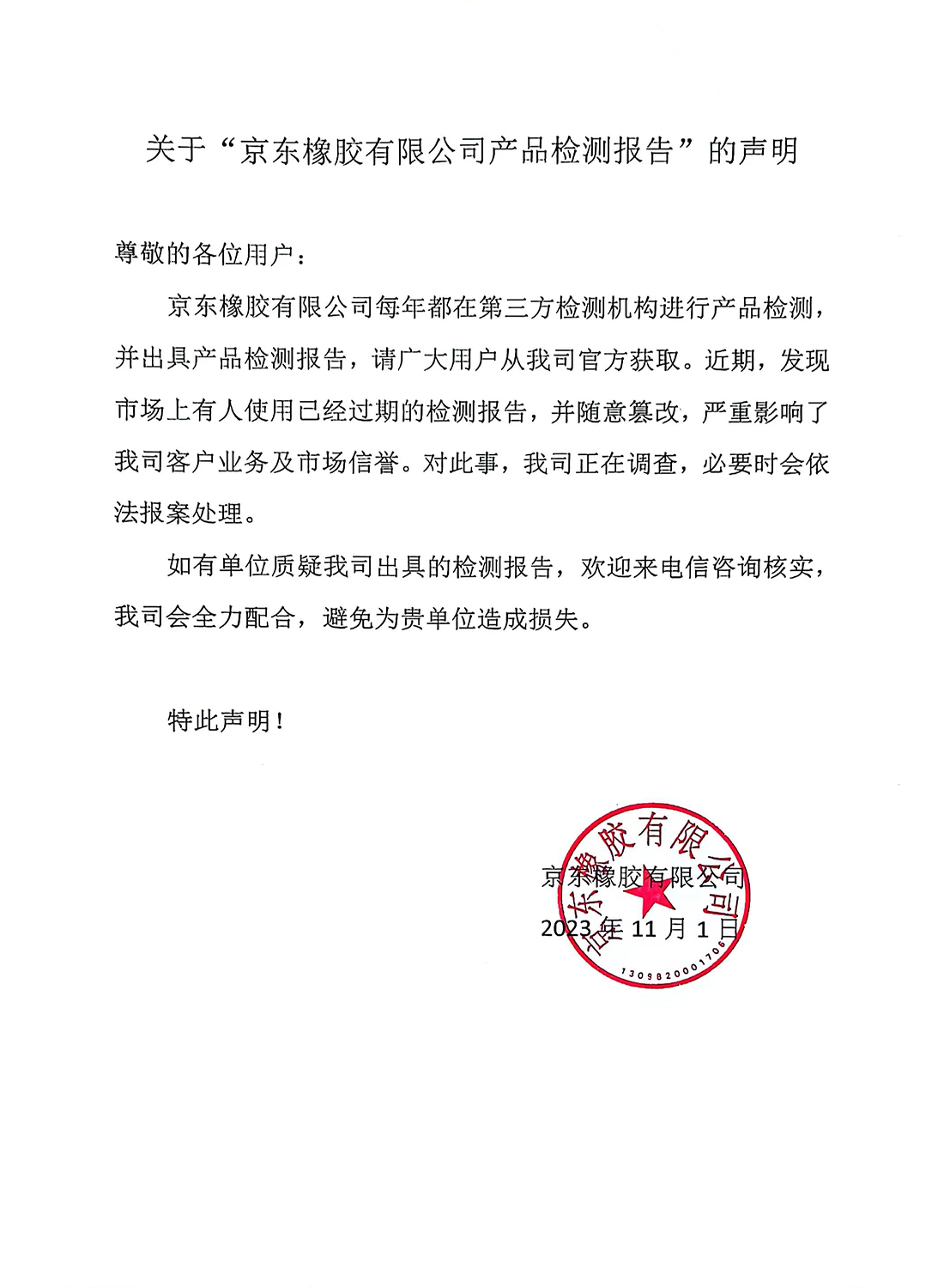 關于“京東橡膠有限公司產品檢測報告”聲明